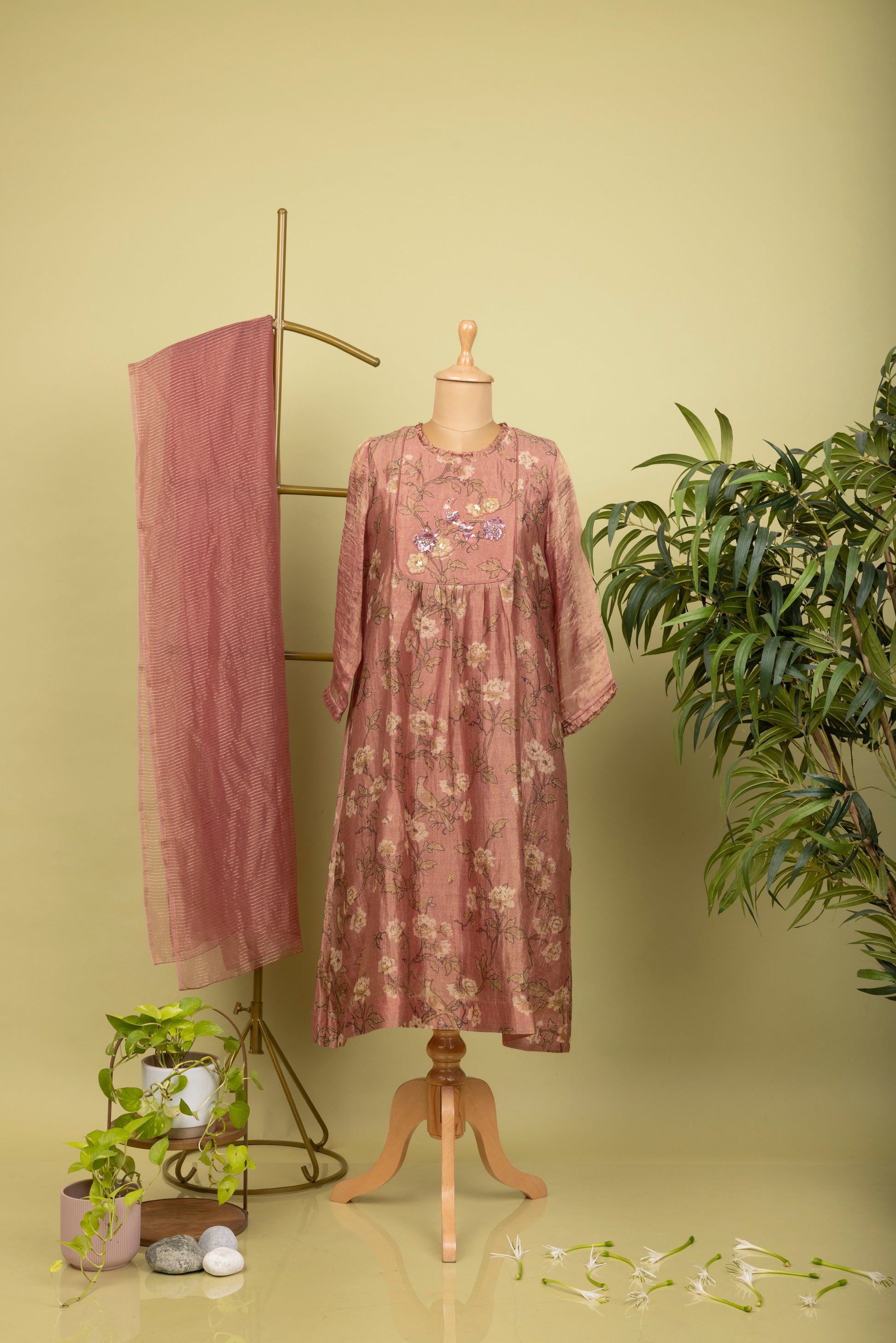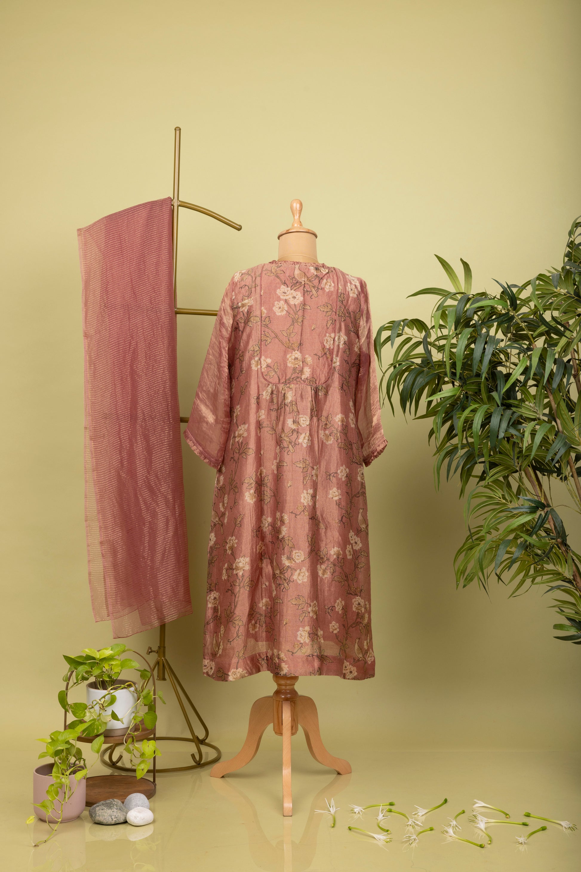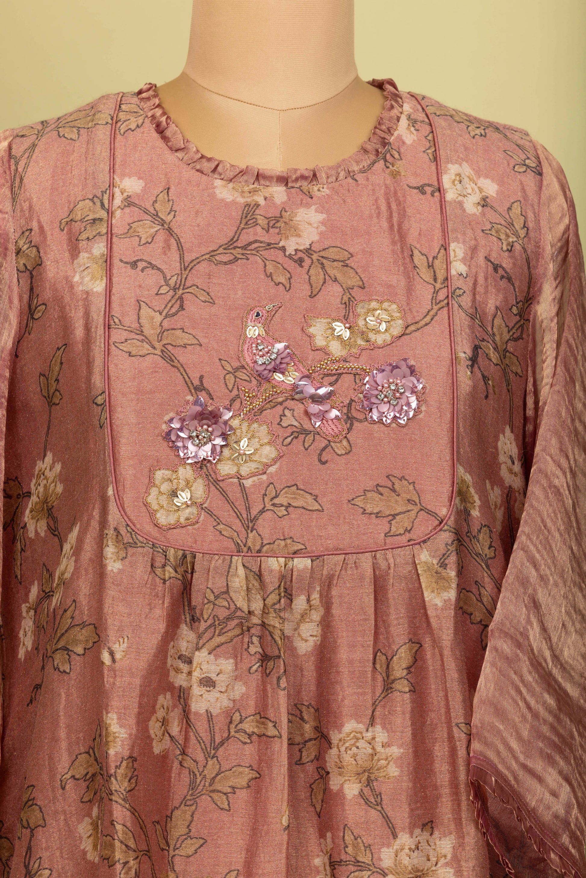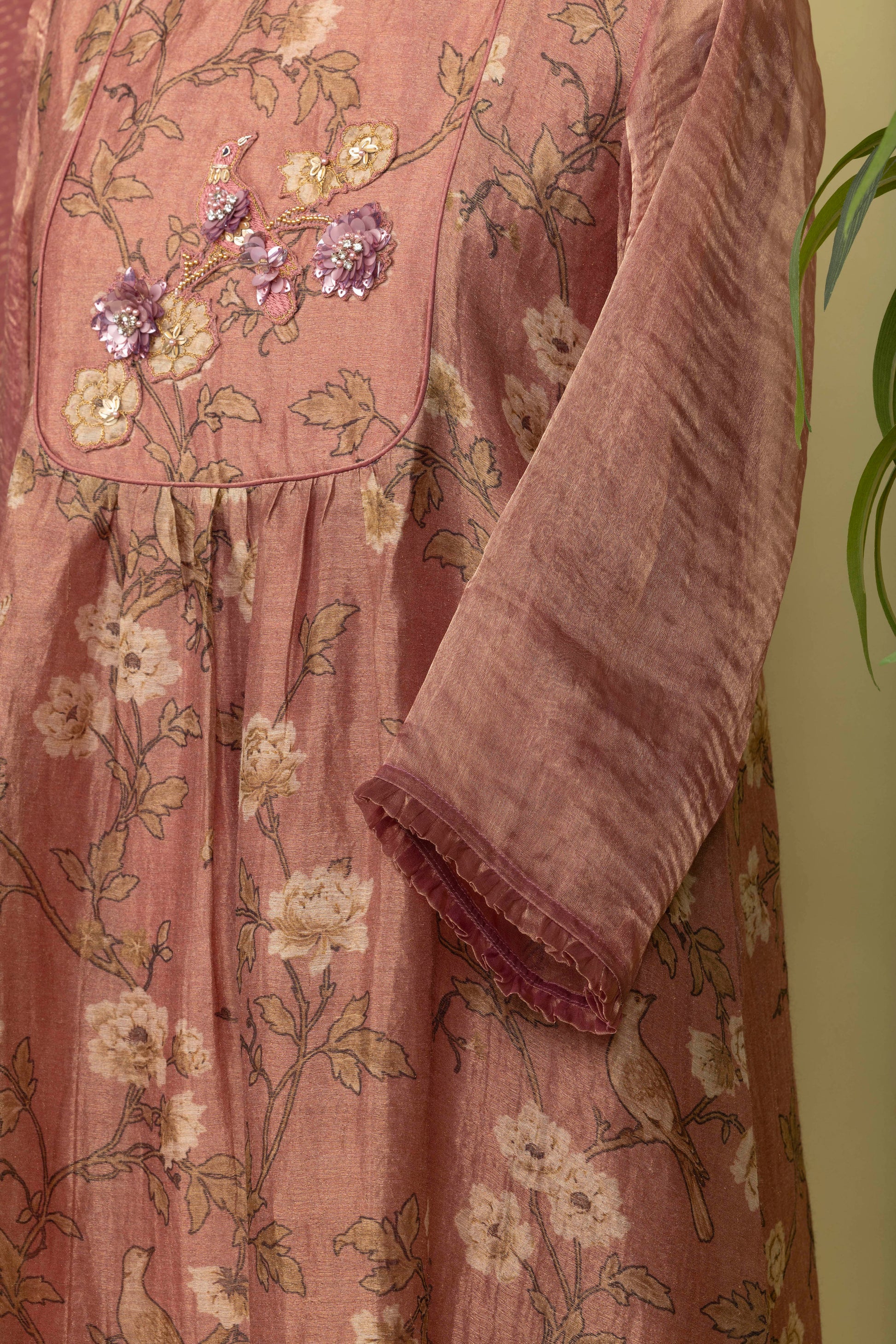 Flamingo pink tissue silk kurta with handcrafted motifs of birds and flowers: slip included (Straight fit and dry clean only).